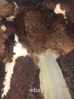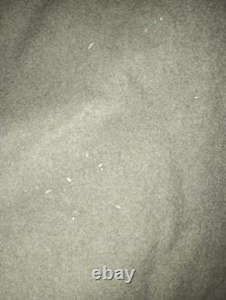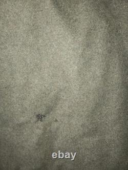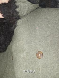 It has some areas of mothing, nothing extravagant. There is one small repair towards the bottom on the front. One button is missing on the front under the fur collar. Measurements are approximately 22 inches armpit to armpit, 19 inch shoulders, 25.5 inch sleeves, 44 inches from shoulder to bottom of coat.